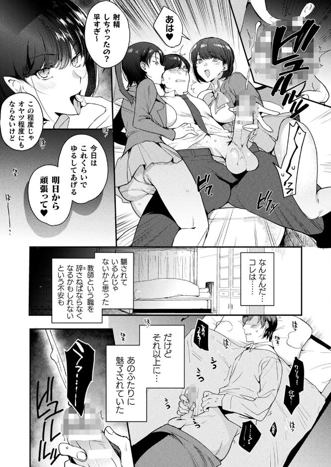 教室で放課後淫らに体をはだけさせ遊んでいた女子校生2人を見つけた男性教諭の田吹は、二人を叱りつけるも初めて抱く生徒への劣情にこっそり男子トイレでオナニーをしてしまい、更に2人に見つかってしまう。